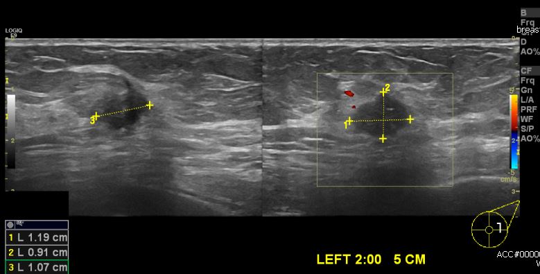 건강검진상 이상소견으로 내원하심 70대 여성분으로 좌측 2시 방향 5cm 떨어진 곳의 의심스러운 혹 중심핵생검 시행하여 좌측 침윤성 유관암 진단 되었습니다.