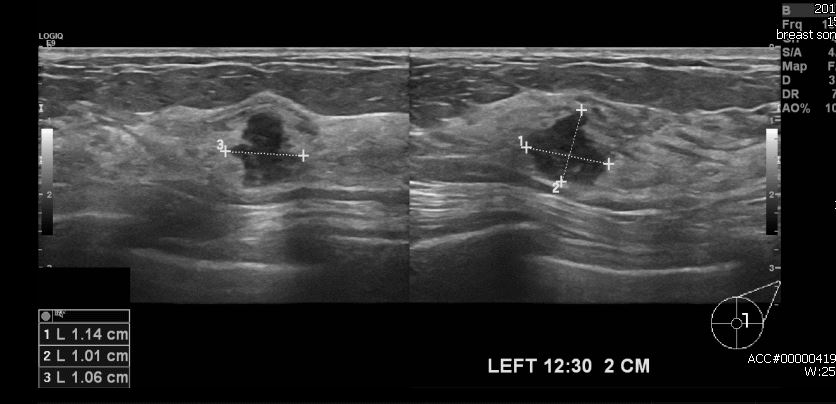 좌측 유방의 12시 30분 방향에서 2cm 떨어진 거리의 혹 조직검사 시행하여