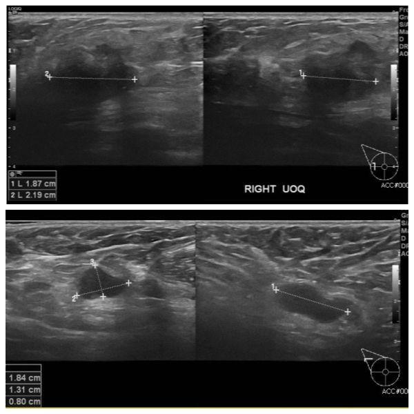우측 유방에 만져지는 멍우리로 내원하신50대 여성분으로 우측 만져지는 멍우리 조직검사 하여 침윤성 암 진단 되었고, 겨드랑이 림프절 비대 세침검사 시행하여 전이암 진단 되었습니다.