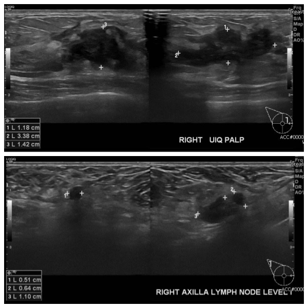 우측 만져지는 멍우리로 내원하신 30대 여성분으로 우측 만져지는 혹 중앙핵생검 시행하여 침윤성 암 진단 되었고, 우측 겨드랑이 림프절비대 세포검사 시행하여 전이암 진단 되었습니다.