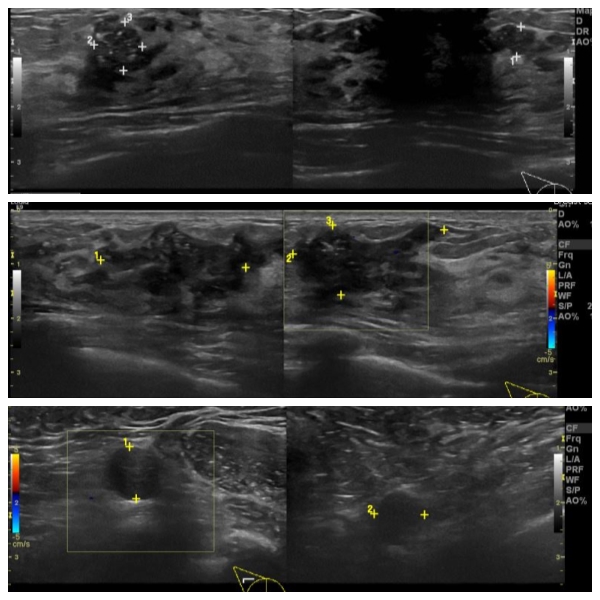 우측 겨드랑이 멍우리로 내원하신 40대 여성분으로 우측 유방의 7시 방향서 3cm 떨어진 거리에 만져지는 혹과, 7시 방향 유륜 밑 중앙핵 생검 시행하여 7시 유두 밑 유관암, 7시 3cm 거리 혹은 침윤성 암 진단 되었고, 우측 겨드랑이 만져지는 멍우리 세포검사 시행하여 전이암으로 진단 되었습니다.떠