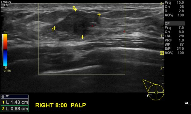 건강검진상 이상 소견으로 내원하신 40대 여성분으로 우측 8시 방향에 만져지는 혹 중앙핵생검 시행하여 우측 유관암 진단 되었습니다.