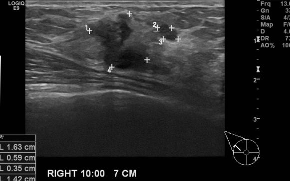 우측의 만져지는 멍우리와 통증으로 내원하신 40대 여성 분으로 우측 10시 방향에서