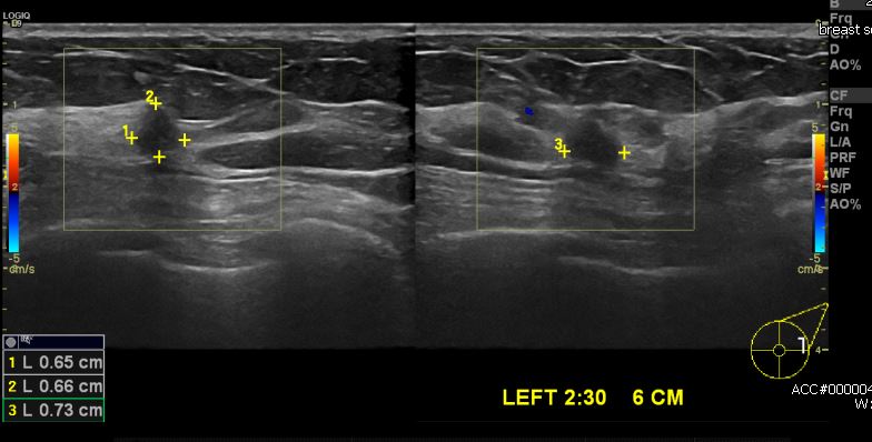2시 30분 방향에 6 cm의 의심 스러운 혹 중앙 핵 생검 시행하여 좌측 침윤성 유관암