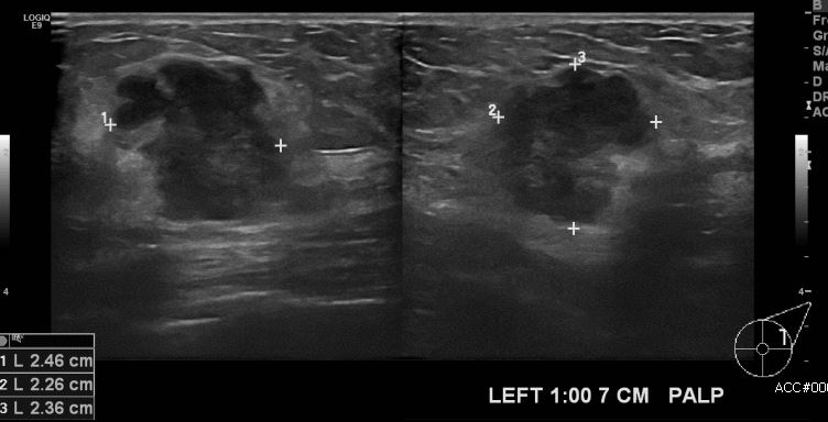 좌측 만져지는 멍우리로 내원하신 50대 여성 분으로 좌측 1시 방향에서 7cm 떨어진