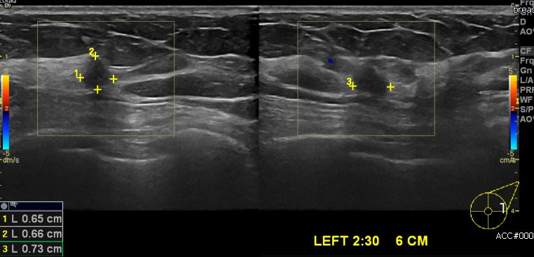 건강검진상 이상 소견으로 내원하신 50대 여성분으로 본원 유방 초음파 시행후 좌측 유방의 2시30분 방향에 6cm 떨어진 거리의 혹 중심핵생검 시행하여 좌측 침윤성 유관암