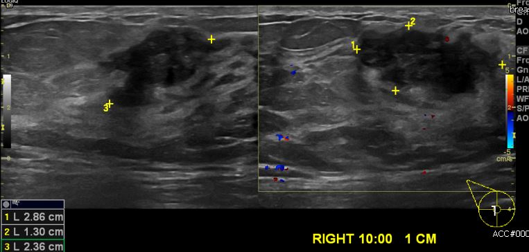 우측 10시 방향 1cm 떨어진 거리에 만져지는 혹 중심핵생검 시행하여 우측 침윤성