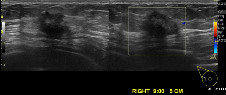 우측 유방에 만져지는 멍울로 내원하신 60대 여성 분으로 우측 9시 방향에서 5cm 거리의 만져지는 혹 중심핵생검 시행하여 우측 침윤성 유관암 진단 되었습니다.