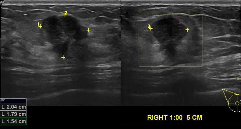 2 달전에 우측유방 멍울발견하여 정밀검진위해 내원하신43세 여자환자 분으로