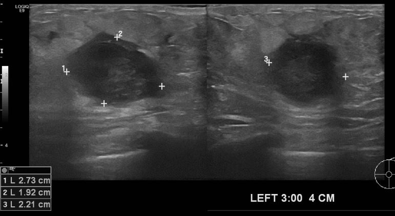 좌측유방 통증과 멍울 있어 내원하신 68세 여자환자분으로 초음파시행후 좌측유방에