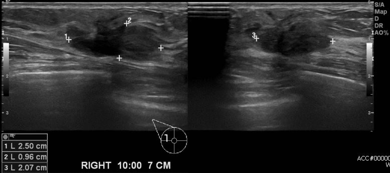 우측 유방에 만져지는 멍우리로 내원하신 50대 여성분으로 우측 10시 방향에서 7cm