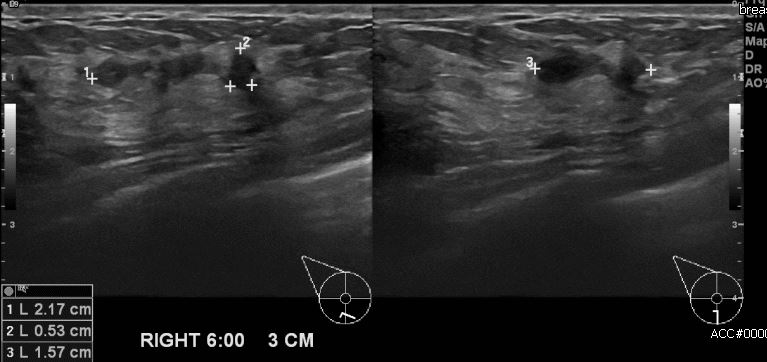 건강 검진상 이상 소견으로 내원하신 40대 여성 분으로 우측 6시 방향에 3cm