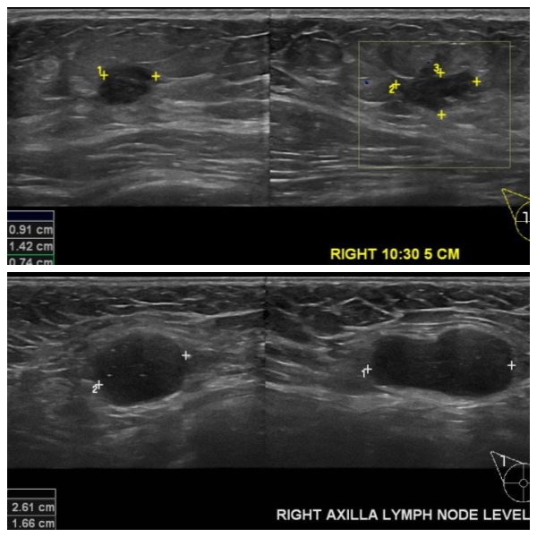 10시 30분 방향 5cm 떨어진 거리의 혹 조직검사 시행하여 우측 침윤성 유관암 진단 되었으며 , 우측 겨드랑이 림프절비대 세침검사 시행하여 전이암으로 진단 되었습니다.