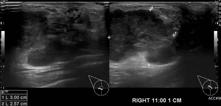 상기 환자 우측 유방에 만져지는 멍우리로 내원하신 20대 여성 분으로 우측 11시 방향