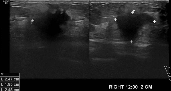 상기 환자 우측 유방에 만져지는 멍우리로 내원하신 40대 여성 분으로 유방 초음파