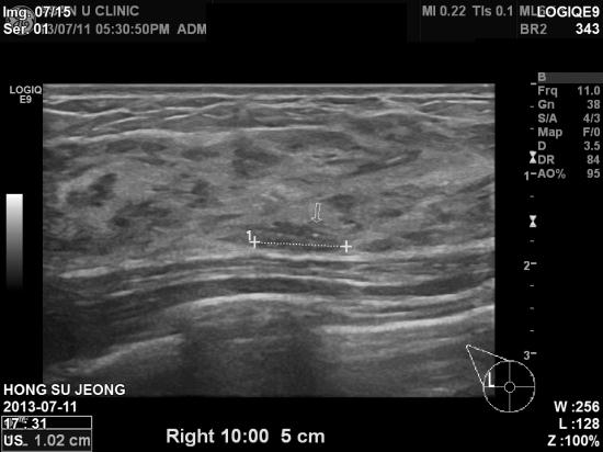 본원에서 유방초음파를 다시 시행하여 조직검사시행 상피내암을 진단 받으셨읍니다.