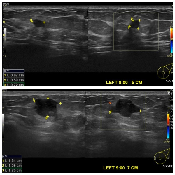 좌측 9시 7cm 떨어진 거리의 의심스러운 혹 조직검사 시행하여 좌측 침윤성유관암