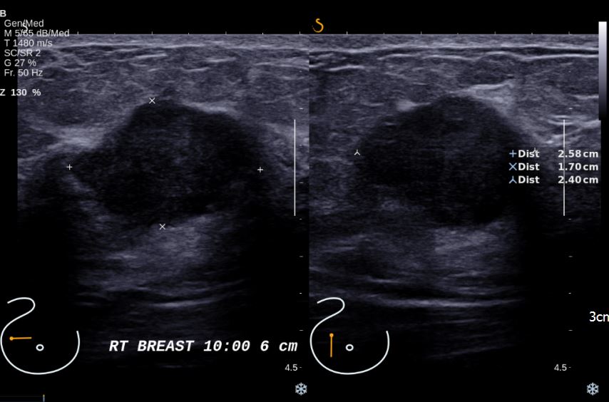 우측유방 10시방향으로 의심스런 혹이있어 중심핵생검 실시한후 침윤성 유관암 진단되셨습니다