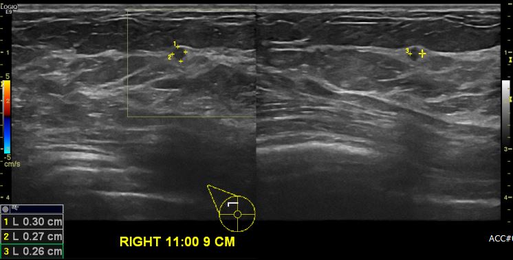 우측 유방 11:00시 방향에서 9cm 떨어진 거리의 의심스러운 혹 조직검사 시행하여