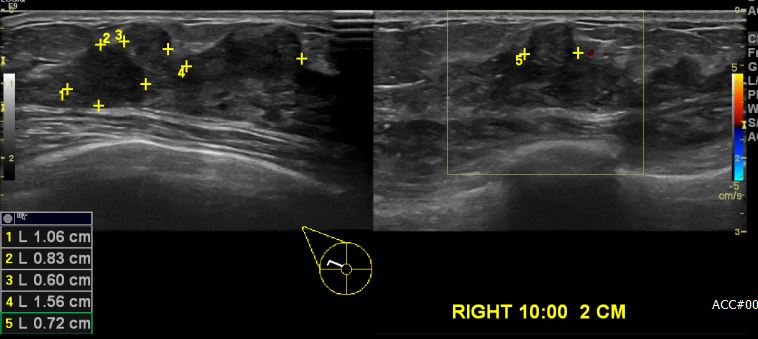 우측 유방통으로 내원하신 40대 여성 분으로 우측 유방 10시 방향에서 2cm 떨어진 거리의 의심스러운 혹 조직검사 시행하여 우측 침윤성 유관암 진단 되었습니다.