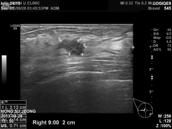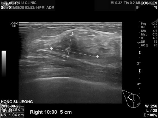 우측 유방에 두개의 혹이 인접하여 있어 조직검사를 실시하여