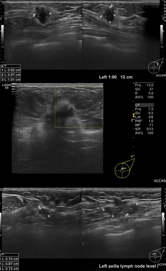 진단 되었으며, 겨드랑이 림프절 비대부 세침검사 시행하여 좌측 전이암 진단 되었습니다.