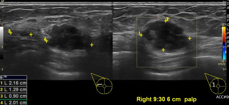 상기환자 우측 유방에 만져지는 멍울있어 내원하시여 우측 9시 30분 방향 6cm
