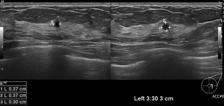 상기 환자 건강검진상 이상 소견으로 내원하신 50대 여성분으로 좌측 3시 30분 방향에서 3cm 떨어진 거리의 혹 조직검사 시행하여 좌측 유관암 진단 되었습니다.