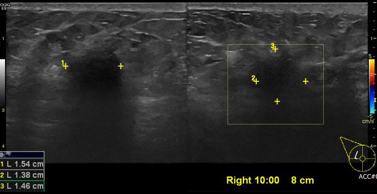 상기환자 우측 유방 비대층과, 통증있어 내원하신 50대 여성분으로 우측 10시 방향 에서 8cm 떨어진 거리의 의심스러운 혹 조직검사 시행하여 우측 침윤성 유관암 진단 되었습니다.