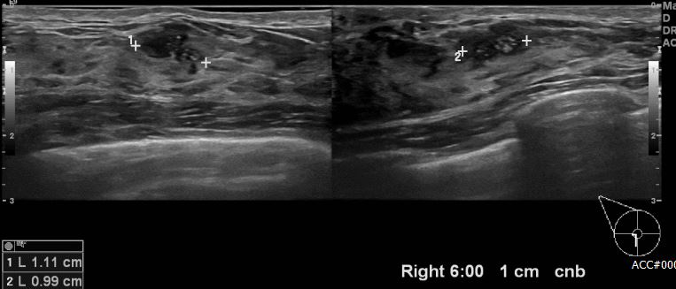 상기환자 좌측 유방암으로 진단받아 치료 중이신 40대 여성 분으로 타원 검진상 우측 6시 방향에서 1cm 떨어진 거리의 의심스러운 멍울 조직검사 시행하여 우측 침윤암 진단 되었습니다.