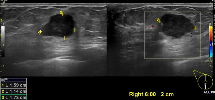 상기환자 우측 만져지는 멍울로 내원하신 70대 여성분으로 본원 초음파 시행 후 우측 6시 방향에서 2cm 떨어진 거리에 의심 스러운 혹 조직검사 시행하여 우측 침윤성 유관암 진단 되었습니다.