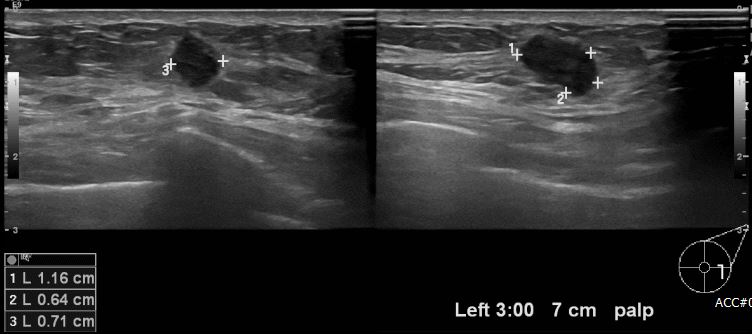 건강검진상 이상소견으로 내원하신 60대 여성분으로 좌측유방 3시 방향에서 7cm 떨어진 거리의 만져지는 멍울 조직검사 시행하여 좌측 침윤성 유관암 진단되었습니다.