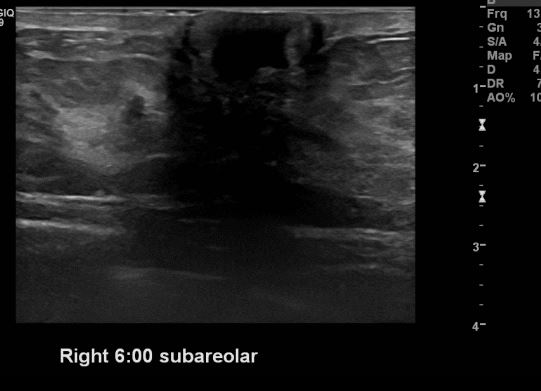 유방 정기초음파상 우측 유방 6시 방향 유두 밑 의심스러운 부분 조직검사 시행하여