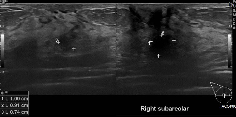 우측 만져지는 멍울로 내원하신 40대 여성분으로 우측 유두밑 으심스러운 부분 조직검사 시행하여 우측 유관암 진단 되었습니다.