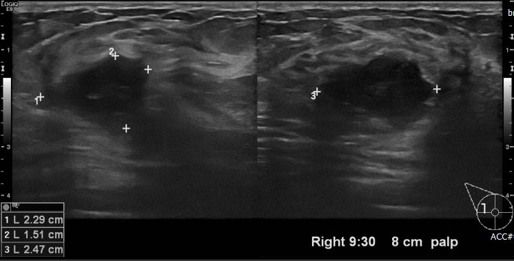 유측 유방에 만져지는 멍울로 내원하신 30대 여성분으로 본원 유방초음파상