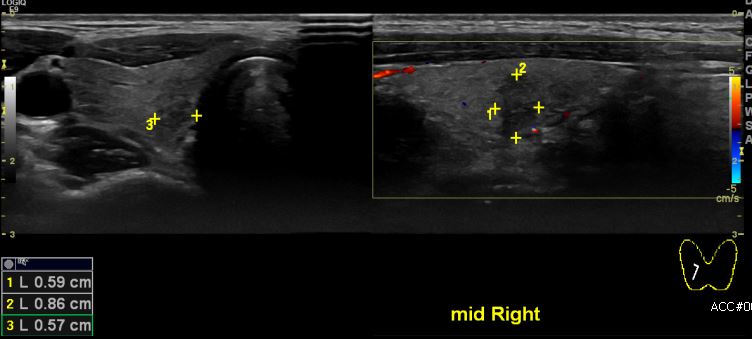 상기환자 갑상선 가족력있어 내원하신 30대 여성분으로 본원 초음파 검사 시행한 결과 우측 갑상선에 의심스러운 0.8cm 결절있어 액상흡인세포병리검사 시행하여 우측 갑상선 유두암 진단 되었습니다.