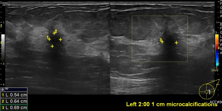 1cm 떨어진 거리의 미세석회 포함된 의심스러운 멍울 조직검사 시행하여 좌측 유관암