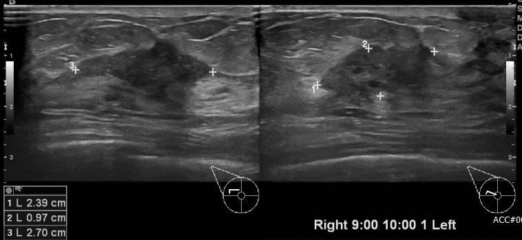 상기환자 우측 만져지는 멍울로 내원하신 50대 여성분으로 유방 초음파상 우측 9시~10시