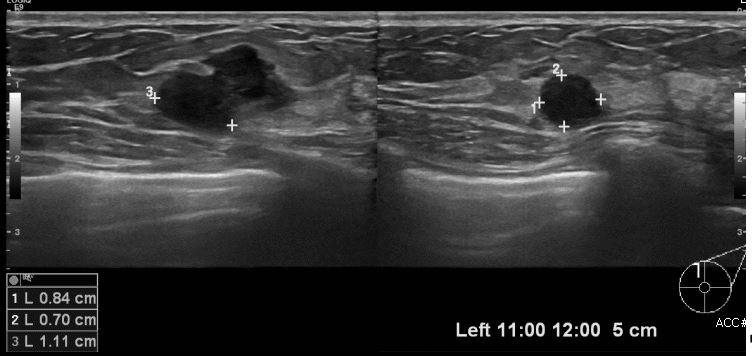 상기환자 좌측 유방에 만져지는 멍울로 내원하신 30대 여성 분으로 좌측 11시에서 12시