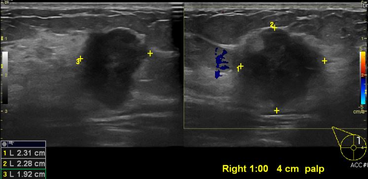 우측 유방에 만져지는 멍울로 내원하신 50대 여성분으로 본원 초음파상 우측유방 1시 방향에서 4cm 떨어진 거리의 만져지는 멍울 조직검사 시행하여 우측 침윤성 유관암 진단 되었습니다.