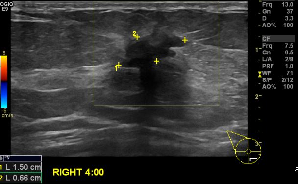 상기환자 우측 유방에 만져지는 멍울로 내원하신 50대 여성 분으로 우측 4시 방향에