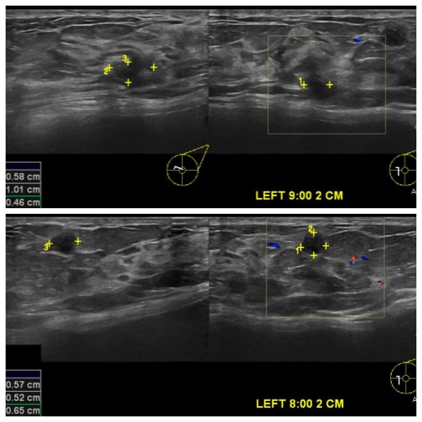 상기환자 좌측 유방의 통증과 멍울로 내원하신 40대 여성분으로 유방초음파 시행 후