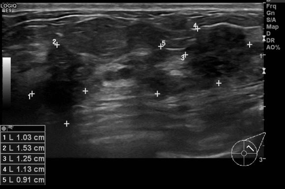 상기환자 40대 여성분으로 우측 겨드랑이 통증으로 내원하시여 유방 초음파 시행 후
