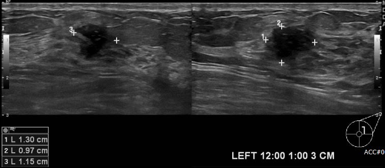 상기환자 좌측 유방에 만져지는 멍울로 내원하신 30대 여성분으로 좌측 12시~1시