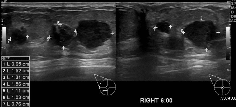 우측유방에 멍울로 내원하신 70대 환자 분으로 우측유방 6시 방향에 의심스러운 멍울