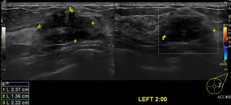 건강검진상 이상소견으로 내원하신 40대 여성분으로 좌측 2시 방향에 의심스러운