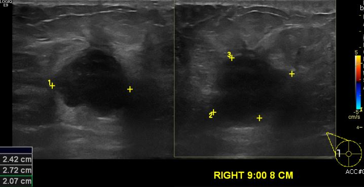 9시 방향에서 8cm 떨어진 거리의 멍울 조직검사 시행하여 우측 침윤성유관암 진단