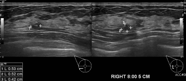 양측 만져지는 멍울로 내원하신 30대 여성분으로 본원 유방초음파 시행후 우측 8시