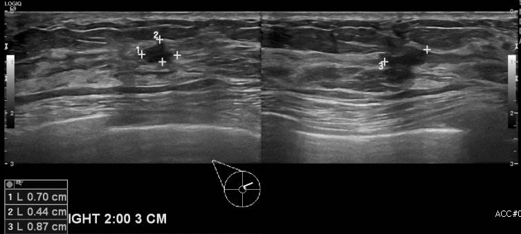 우측 유방통증으로 내원하신 40대 여성분으로 본원 초음파상 우측 2시방향에서 3cm