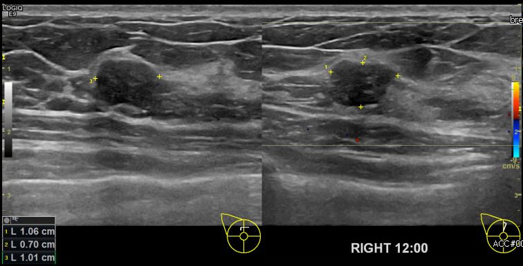 우측 유방 12시 방향에 의심스러운 멍울 조직검사 시행하여 우측 침윤성 유관암